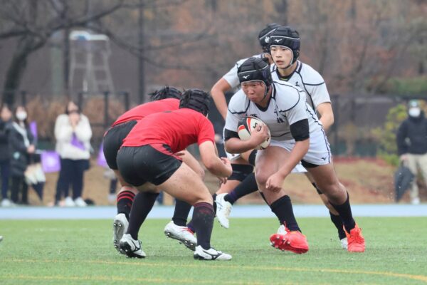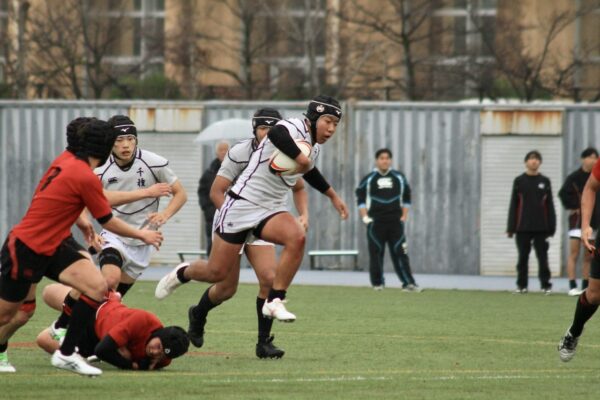 前半早々、自陣ゴール近くから旭野がモールを組み、一度は止めましたが、展開されてトライ。旭野が先制します。その後すぐ、千種が相手陣深くのペナルティから⑫水田が突っ込み、同点。その後も取り合い、前半終了間際にキックチャージから千種がトライを取り、19-10でリードして折り返します。